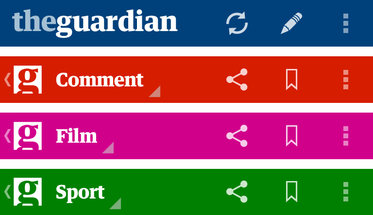 Since headers are present in different sections of the app, chromatic consistency must be maintained when navigating different sections. However, some apps (an example being that of news publication The Guardian) make use of headers to play with variations of color that mark a visual difference between each section. The header extends visual identity and at the same time gives the user a better understanding of the section he or she is visiting.